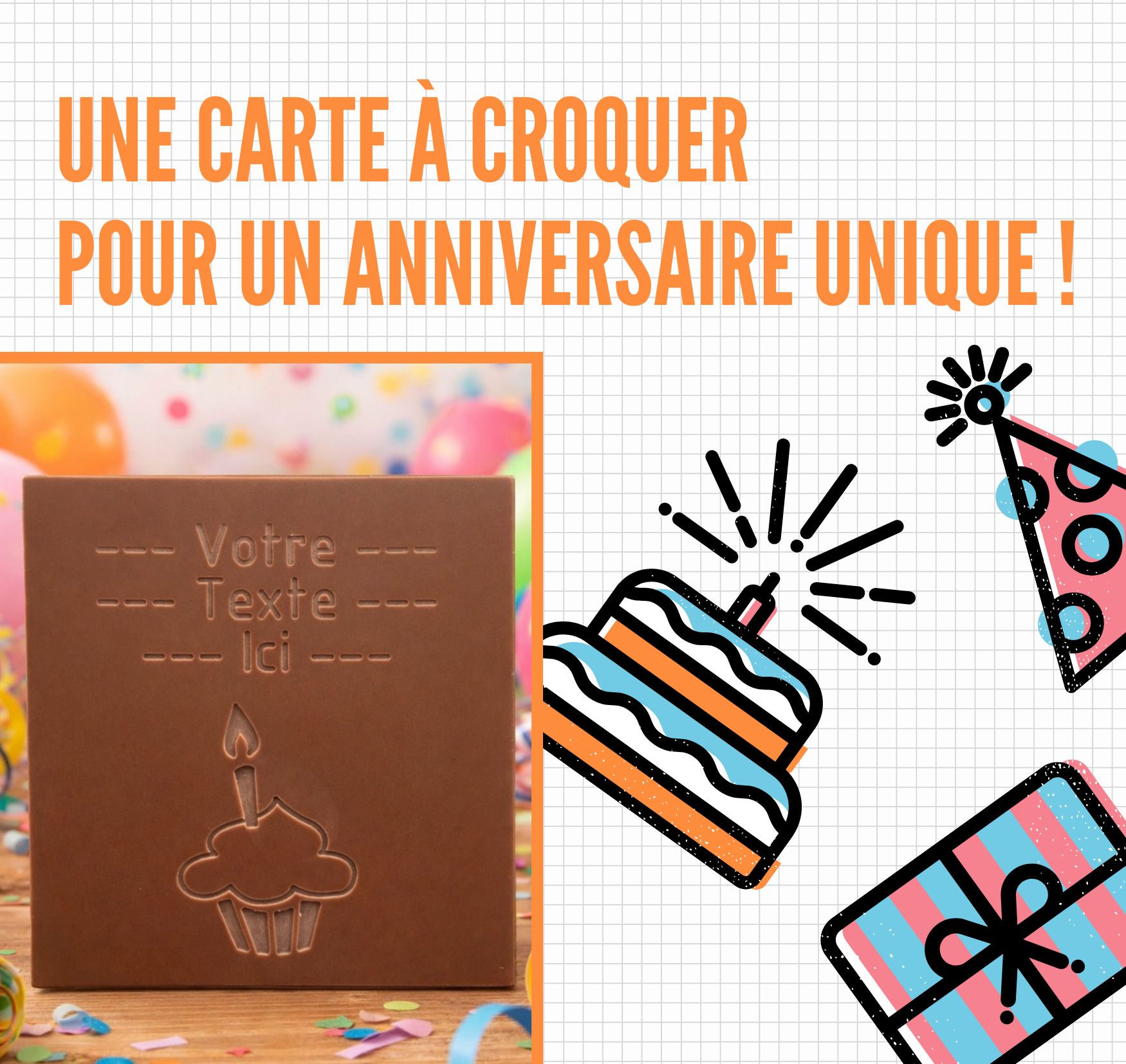 Star inconditionnelle des événements familiaux, la carte d'annonces, de voeux, d'anniversaire... devient gourmande ! Découvrez tous nos modèles de cartes à croquer en chocolat à personnaliser selon vos événements !