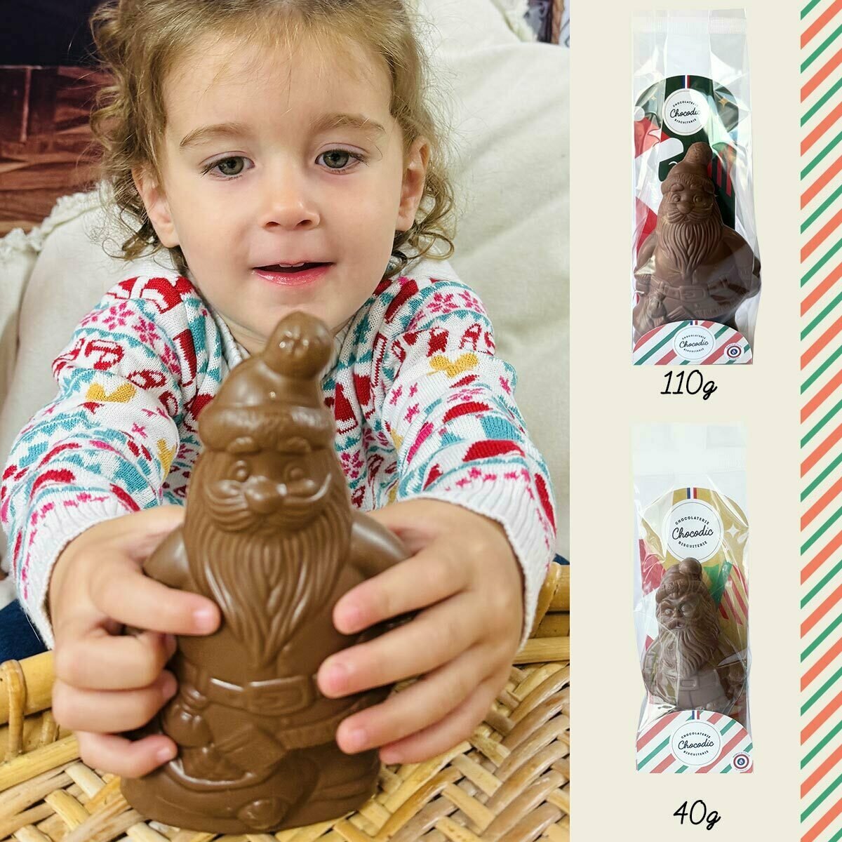 Chez Chocodic, nous croyons en la magie de Noël et en l'importance de la qualité de nos produits. C'est pourquoi chaque Père-Noël en chocolat est réalisé de manière artisanale, avec le plus grand soin. Notre chocolat au lait est d'une grande finesse, offrant une saveur onctueuse qui fond délicieusement en bouche. Chaque moulage est emballé individuellement sous un sachet cristal prêt à offrir, ce qui en fait le cadeau parfait pour célébrer les fêtes.