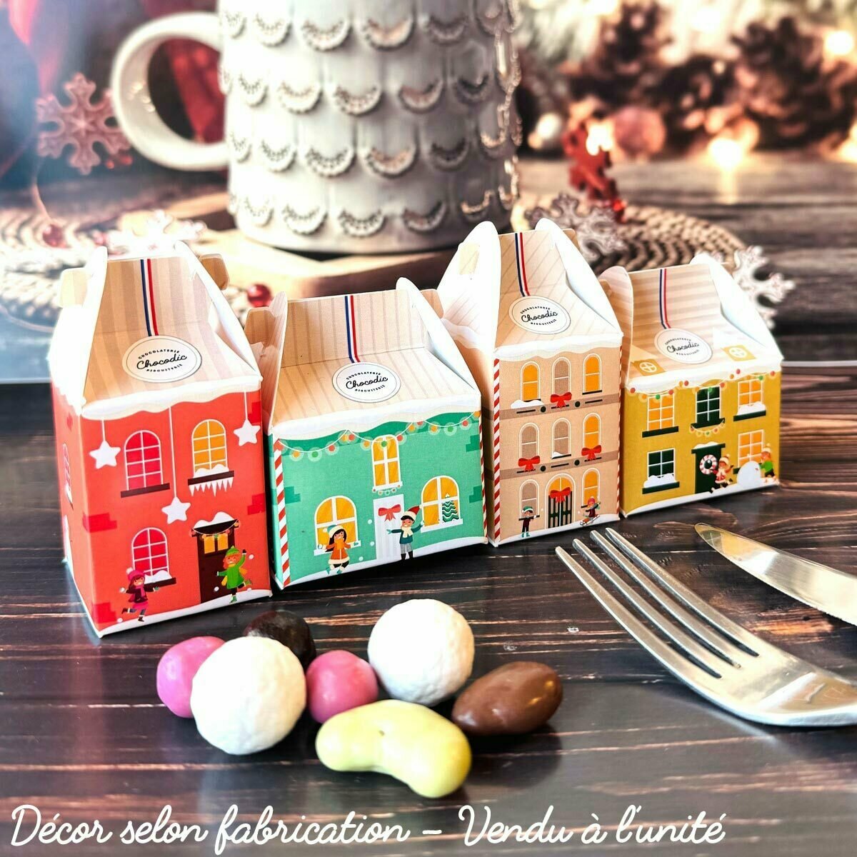Décorez vos tables de fêtes avec nos charmantes petites maisons, parfaites comme cadeaux pour vos convives à disposer dans les assiettes ou pour décorer sous le sapin. Chaque maison renferme des noisettes, amandes et billes de céréales enrobées de chocolat noir à 73% de cacao, ainsi que de chocolat au lait, blanc, caramel et chocolat blanc caramel ... Disponibles dans un assortiment de coloris (selon fabrication), ces délices combinent esthétique et saveurs exquises pour créer une ambiance festive. Vendu à l'unité.
