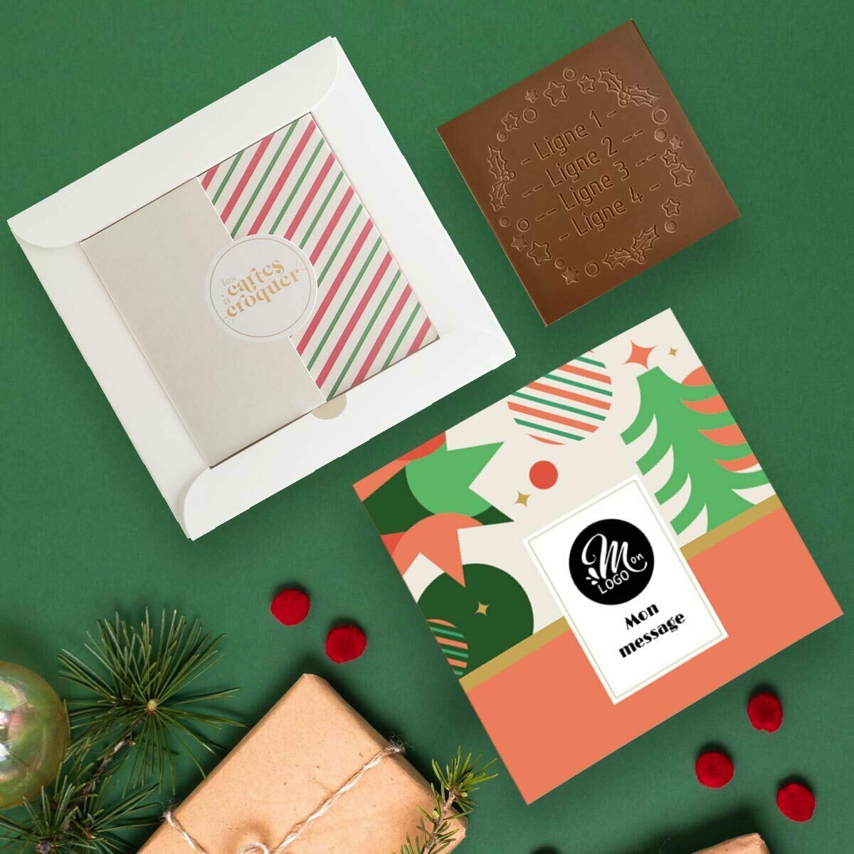 Offrez à vos clients et partenaires un cadeau unique et gourmand avec la Carte à Croquer Couronne de Fête. Ce produit innovant allie l'art de la communication à la douceur du chocolat haut de gamme. Rien de mieux pour marquer les esprits que de combiner un message personnalisé avec une délicieuse tablette de chocolat. Pour les fêtes de fin d'année, optez pour l'originalité et la finesse, et montrez à vos collaborateurs combien vous tenez à eux avec un cadeau qui se distingue par son raffinement.