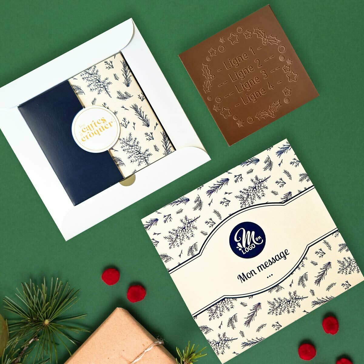 La Carte à Croquer Couronne de Fête est le cadeau d'entreprise idéal pour les fêtes de fin d'année. Offrez à vos clients et partenaires une délicieuse tablette de chocolat haut de gamme, personnalisable avec un message de 4 lignes gravé directement sur le chocolat. Choisissez entre chocolat noir 73%, lait 33%, ou lait caramel 35%, tous issus d'une agriculture durable. Personnalisez également le design du coffret avec votre logo pour renforcer l'identité de votre marque. Alliant originalité, qualité et engagement écologique, cette carte gourmande est un moyen unique et mémorable de célébrer vos relations professionnelles.