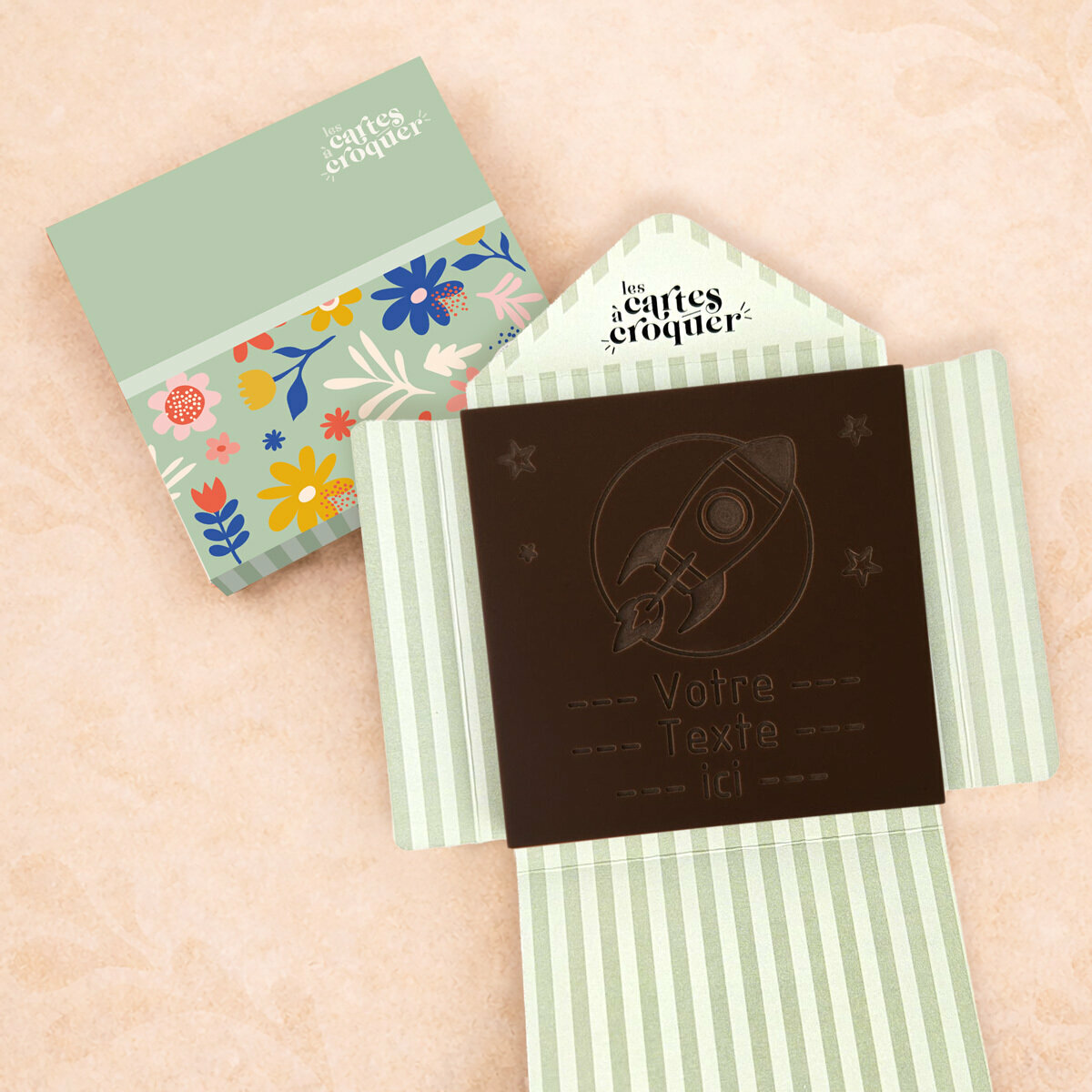 Faites voyager vos messages avec la Carte à Croquer – Modèle Fusée, une création originale en chocolat au lait artisanal qui fait autant fondre les cœurs que les papilles. Que ce soit pour fêter une naissance, un anniversaire ou simplement pour envoyer une attention sucrée, cette carte allie créativité, émotion et gourmandise. Son design joyeux en forme de fusée ravira petits et grands, tout en apportant une touche de magie à vos messages.