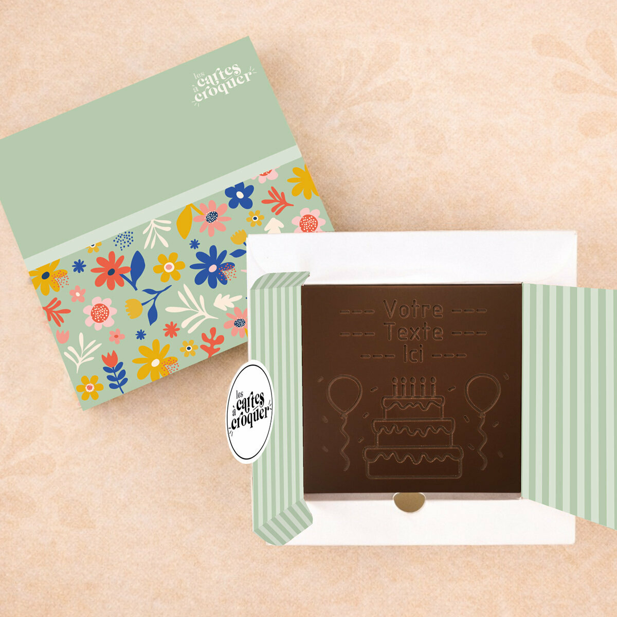 La Carte à Croquer – Modèle Gâteau d’Anniversaire célèbre chaque anniversaire avec gourmandise. Gravure d’un gâteau, ballons et cotillons et personnalisation sur 3 lignes de 15 caractères dans du chocolat noir, lait ou lait-caramel. Artisanale et unique, elle transforme vos vœux en un cadeau délicieux et mémorable.