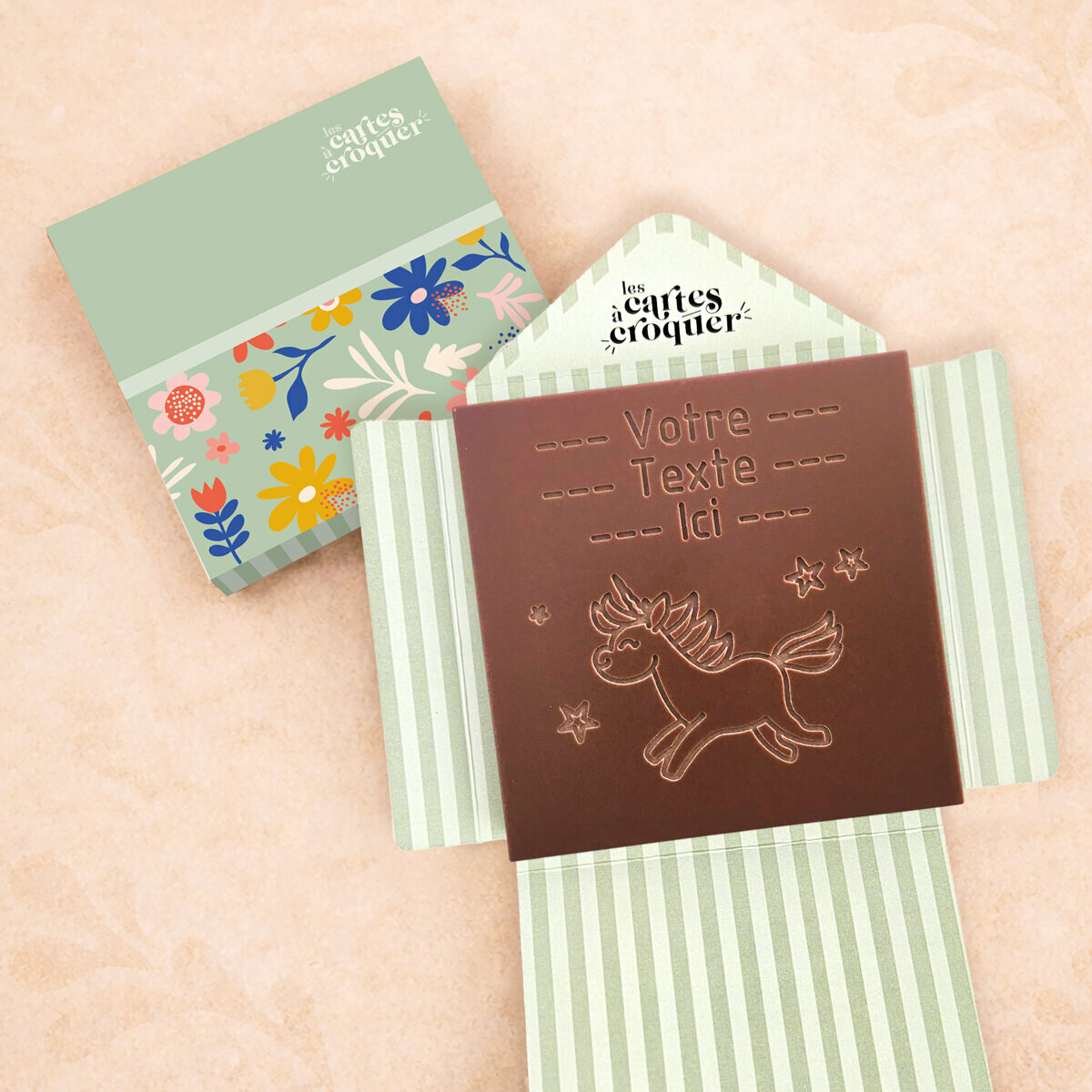 La Carte à Croquer – Modèle Licorne émerveille petits et grands pour un anniversaire. Gravure d’une licorne et de votre message sur 3 lignes de 15 caractères dans du chocolat noir, lait ou lait-caramel. Artisanale et personnalisable, elle offre un cadeau magique, original et délicieux à savourer.