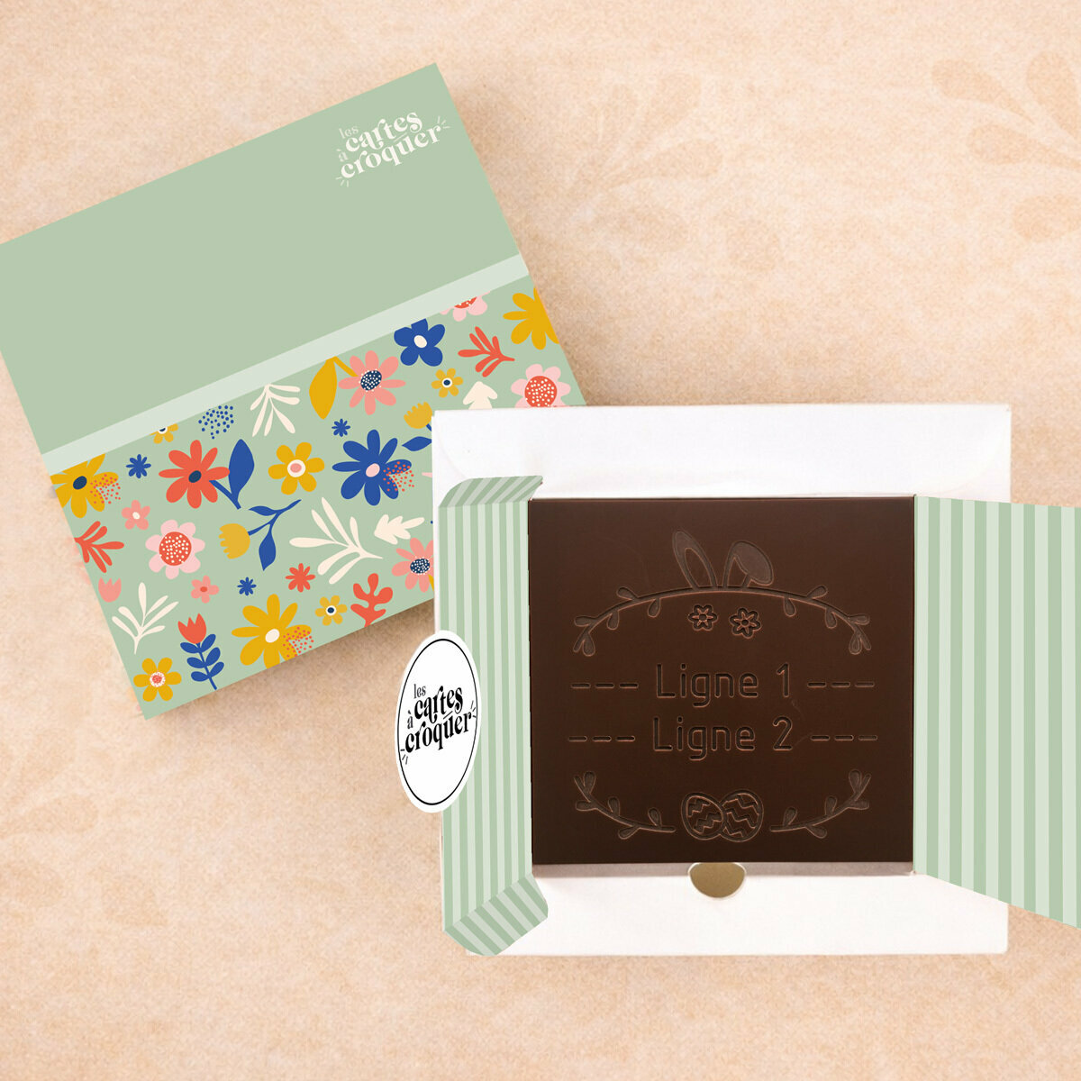 La Carte à Croquer – Modèle Couronne de Pâques célèbre Pâques avec gourmandise et originalité. Gravure d’une couronne de Pâques et personnalisation sur 2 lignes de 15 caractères dans du chocolat noir, lait ou lait-caramel. Artisanale et unique, elle transforme vos vœux en un cadeau délicieux et mémorable.