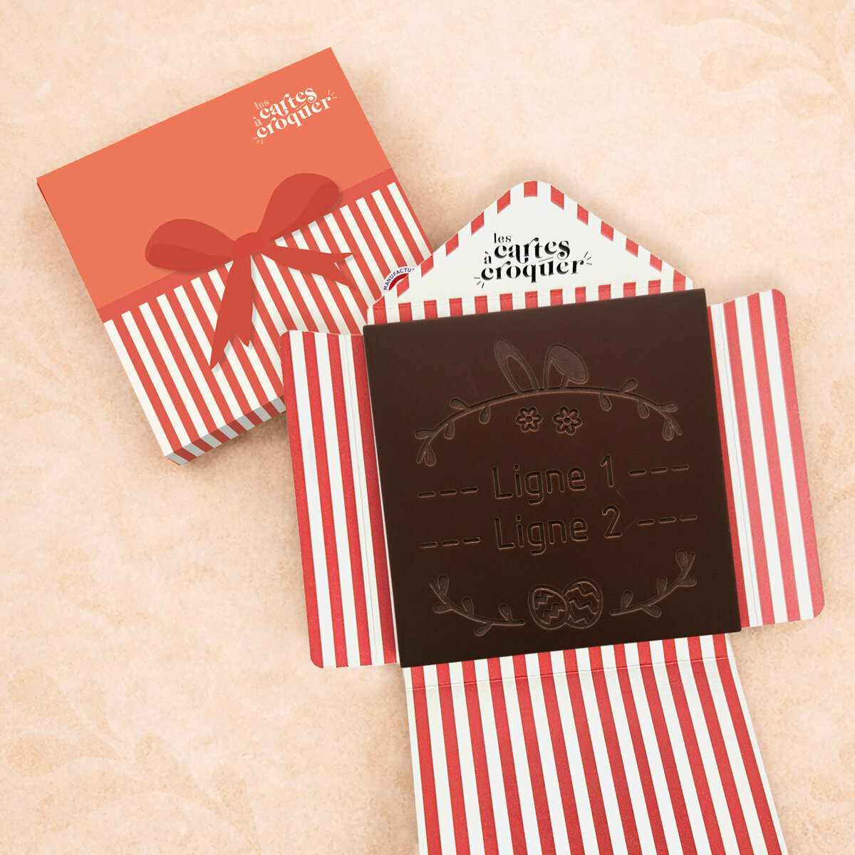 Ce modèle permet de personnaliser 2 lignes de 15 caractères chacune, soit 30 caractères au total. Vous pouvez inscrire un prénom, un court message ou un petit mot doux pour Pâques. La gravure est réalisée directement dans le chocolat, assurant un rendu élégant et lisible. Chaque carte devient ainsi unique et personnelle, reflétant l’attention portée au destinataire et rendant ce cadeau encore plus spécial. La personnalisation apporte une dimension émotionnelle et rend le geste mémorable.