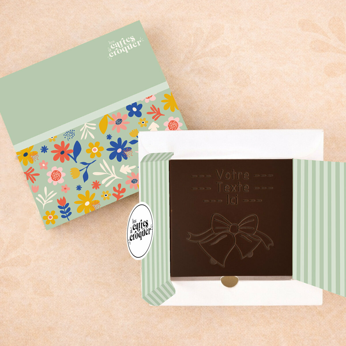 La Carte à Croquer – Modèle Cloches de Pâques célèbre Pâques avec gourmandise et charme. Gravure de cloches festives et personnalisation sur 3 lignes de 15 caractères dans du chocolat noir, lait ou lait-caramel. Artisanale et unique, elle transforme vos vœux en un cadeau délicieux et mémorable.