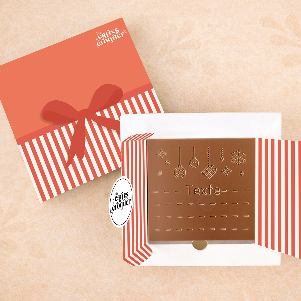 Au-delà de son aspect visuel, cette carte offre une expérience sensorielle complète. Le chocolat fond délicatement en bouche, libérant des arômes riches et subtils. La gravure des motifs festifs et de votre message personnalisé ajoute une dimension émotionnelle unique. Chaque bouchée devient un moment de plaisir et de complicité, transformant un simple geste en un souvenir gourmand et festif. La combinaison entre esthétique, goût et personnalisation fait de cette carte un cadeau exceptionnel et mémorable.