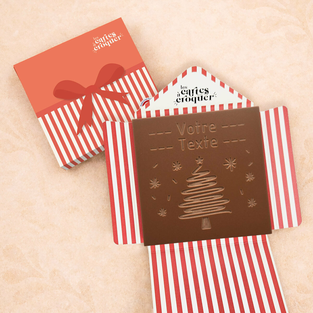 La Carte à Croquer – Modèle Sapin célèbre Noël et le Nouvel An avec gourmandise et élégance. Gravure d’un sapin de Noël et personnalisation sur 2 lignes de 15 caractères dans du chocolat noir, lait ou lait-caramel. Artisanale et unique, elle transforme vos vœux en un cadeau délicieux et mémorable.