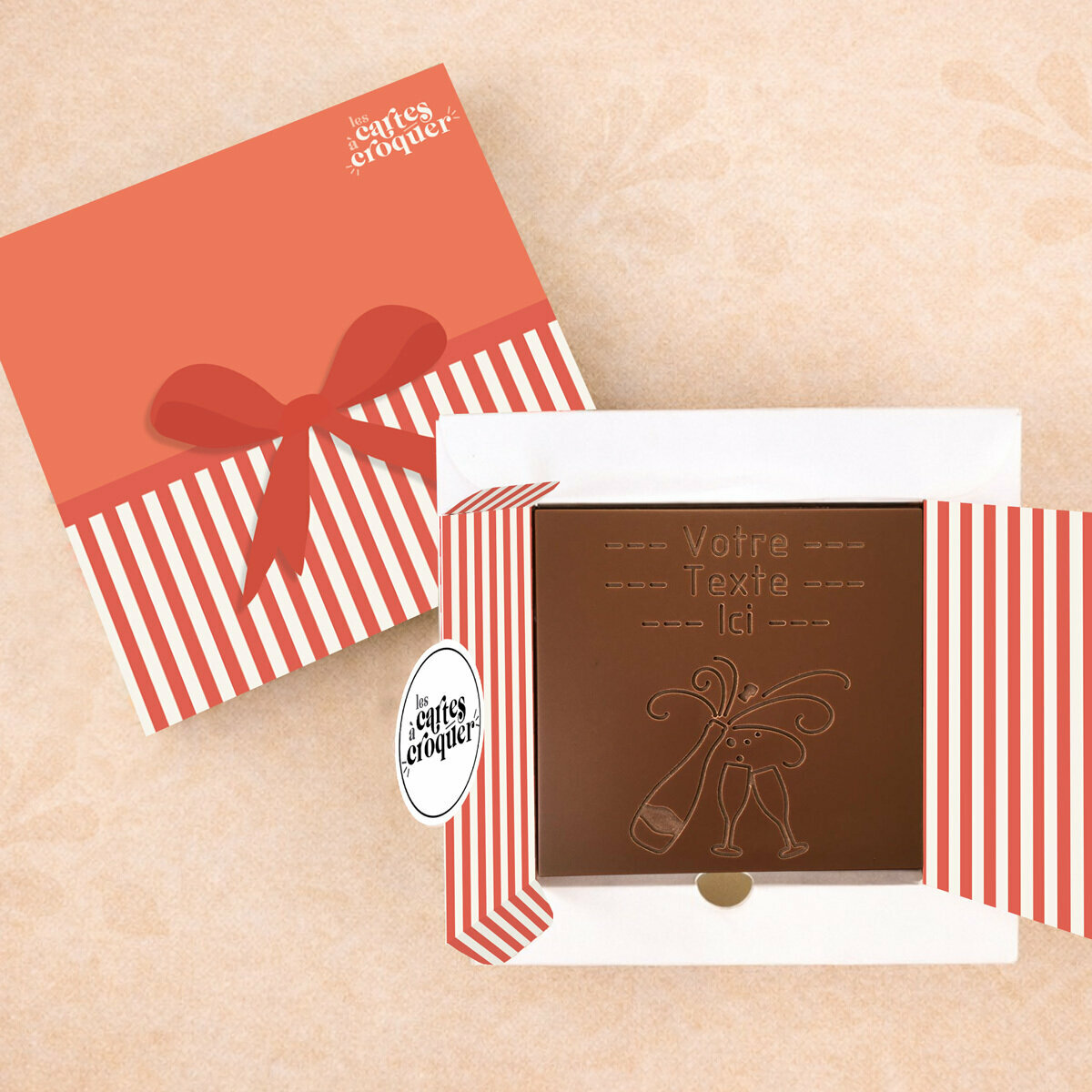 La Carte à Croquer – Modèle Champagne célèbre Noël et le Nouvel An avec gourmandise et élégance. Gravure d’une bouteille de champagne et personnalisation sur 3 lignes dans du chocolat noir, lait ou lait-caramel. Artisanale et unique, elle transforme vos vœux en un cadeau festif et délicieux.