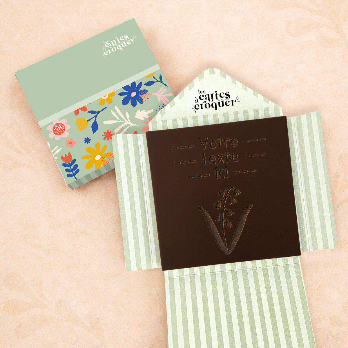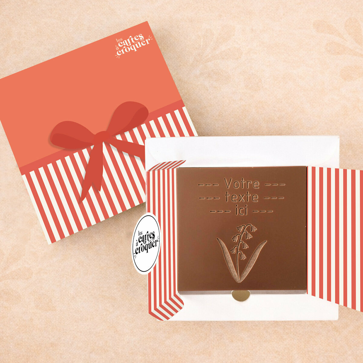 La Carte à Croquer – Modèle Brin de Bonheur est une façon originale et délicieuse de célébrer l’amour, la chance et les moments précieux. Chaque carte est décorée d’un brin de muguet gravé dans le chocolat, symbole traditionnel du mois de mai et du bonheur partagé. Disponible en chocolat noir, lait ou lait-caramel, ce produit combine esthétique et gourmandise, faisant de chaque carte un cadeau mémorable. Que ce soit pour la tradition du muguet ou pour offrir un message tendre et personnalisé, cette carte transforme un simple geste en un moment unique.