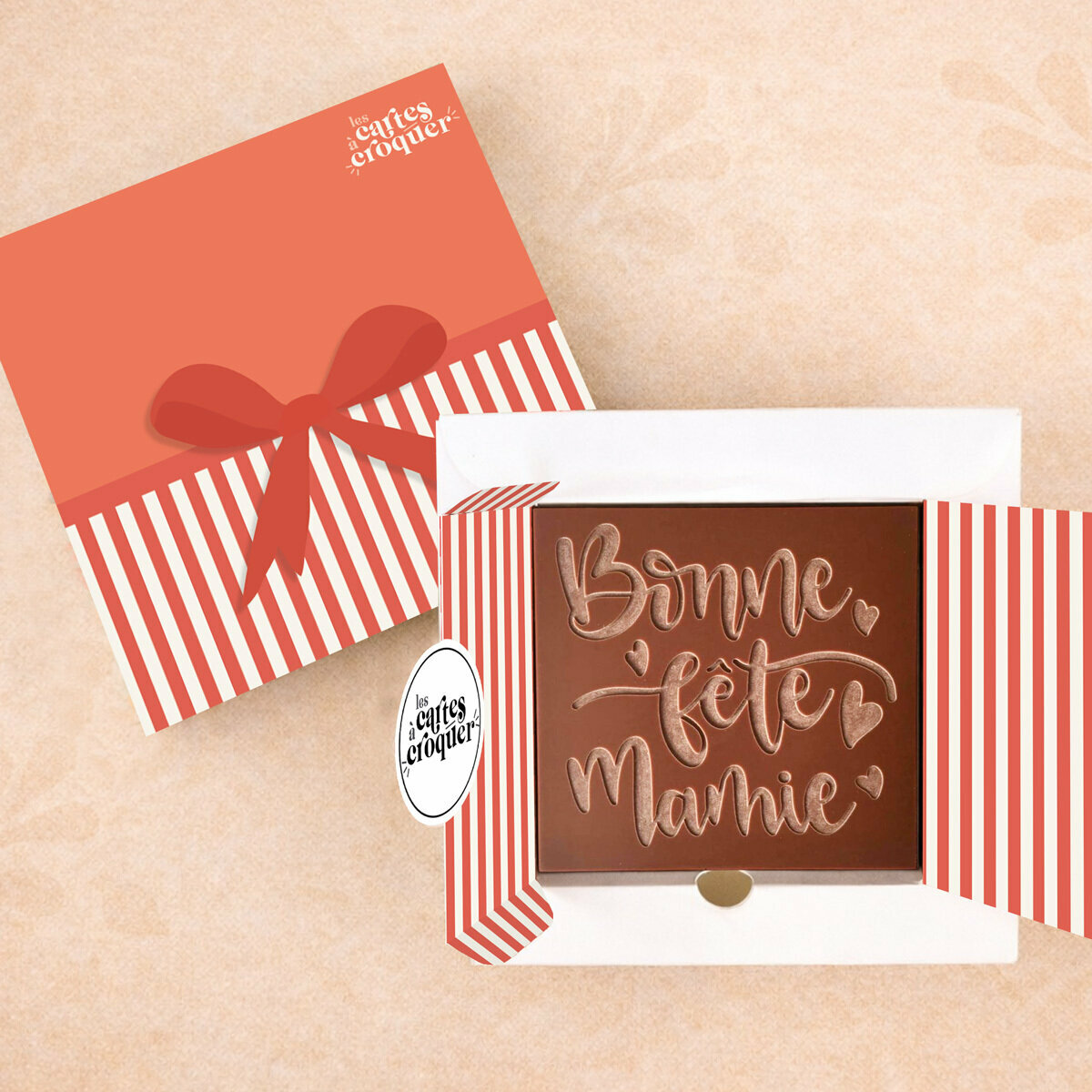La Prête à Croquer – Modèle Bonne Fête Mamie est une attention aussi tendre que gourmande. Pour célébrer votre grand-mère de manière originale, cette carte en chocolat remplace la traditionnelle carte papier par une version délicieusement savoureuse. Gravée du message « Bonne Fête Mamie », elle exprime votre affection avec simplicité et douceur.