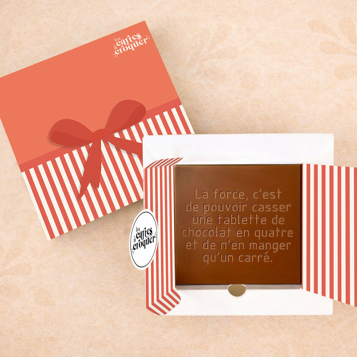 La Prête à Croquer – Modèle La Force est une création aussi gourmande qu’amusante. Gravée du message « La Force c’est de pouvoir casser une tablette de chocolat en quatre et de n’en manger qu’un carré », cette carte en chocolat joue avec une vérité universelle… et délicieusement ironique.