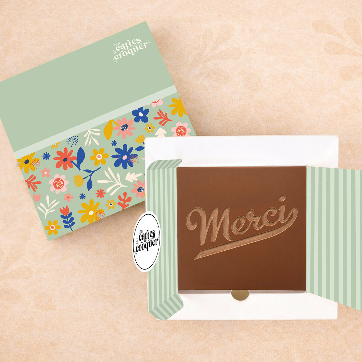 Avec son inscription “Merci” gravée dans le chocolat, cette carte se distingue par son originalité. Le message apparaît en relief, offrant un rendu visuel élégant et impactant dès le premier regard.