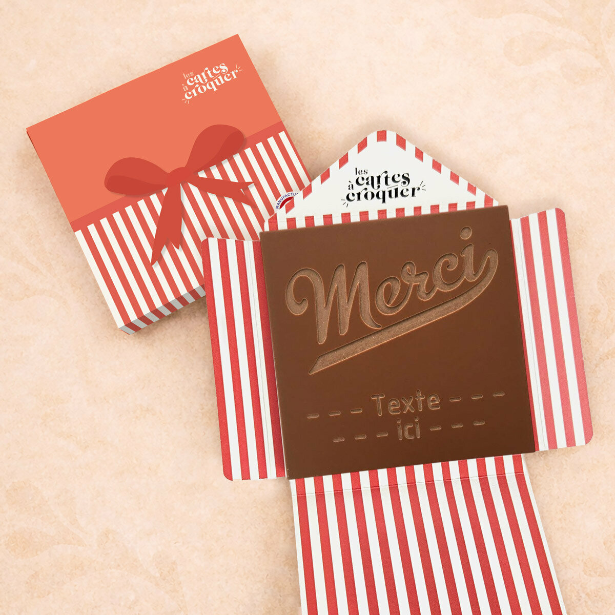 Le Modèle Merci offre la possibilité de personnaliser jusqu’à 2 lignes de 15 caractères chacune, soit 30 caractères au total, pour inscrire un message personnel. Vous pouvez y écrire un prénom, un petit mot tendre ou une phrase courte qui accompagnera le mot « Merci » déjà gravé. La gravure est réalisée avec précision sur le chocolat noir, lait ou lait-caramel, garantissant un rendu élégant et lisible. Cette personnalisation transforme chaque carte en un cadeau unique, où vos mots deviennent partie intégrante du chocolat lui-même.