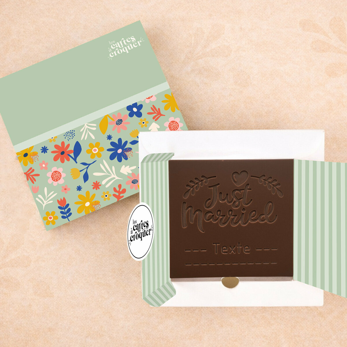 La Carte à Croquer – Modèle Just Married est une délicieuse création en chocolat noir, lait ou lait-caramel, personnalisable sur 2 lignes de 15 caractères. Sa gravure “Just Married” en fait un cadeau artisanal unique, idéal pour célébrer un mariage avec une touche gourmande et inoubliable.