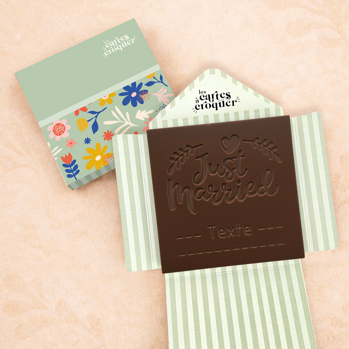 La particularité de cette carte réside dans sa gravure délicate et raffinée. Le chocolat accueille, en premier lieu, l’inscription “Just Married”, symbole universel de la célébration du mariage.