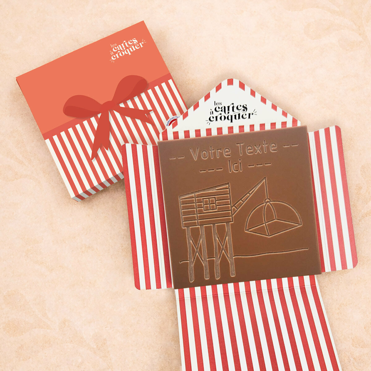 Le Modèle Pêcherie permet de personnaliser 2 lignes de 15 caractères chacune, soit un total de 30 caractères. Vous pouvez inscrire un prénom, une date ou un mot tendre. La gravure est réalisée directement dans le chocolat, garantissant un rendu lisible et élégant. Chaque message personnalisé transforme la carte en un cadeau unique et significatif, parfait pour marquer un événement ou une occasion spéciale. Cette personnalisation ajoute une dimension émotionnelle à votre geste, faisant de ce chocolat un souvenir mémorable pour le destinataire.