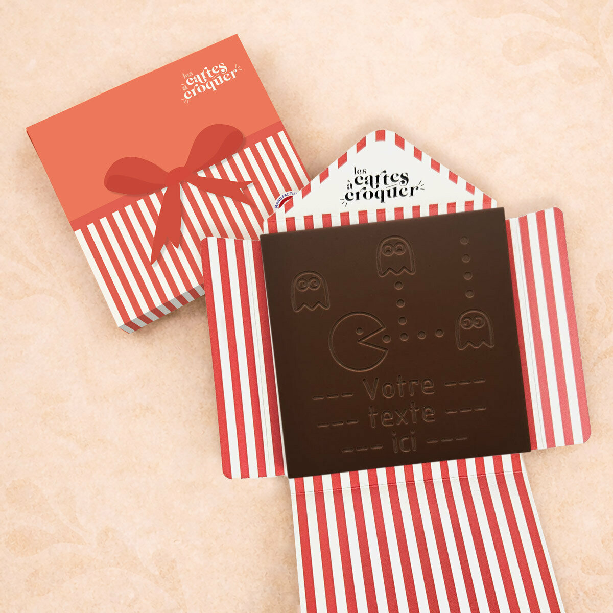 La Carte à Croquer – Modèle Pacman apporte gourmandise et humour pour un anniversaire ou un message drôle. Gravure de Pacman et de votre message sur 3 lignes de 15 caractères dans du chocolat noir, lait ou lait-caramel. Artisanale et personnalisable, elle offre un cadeau original et ludique.