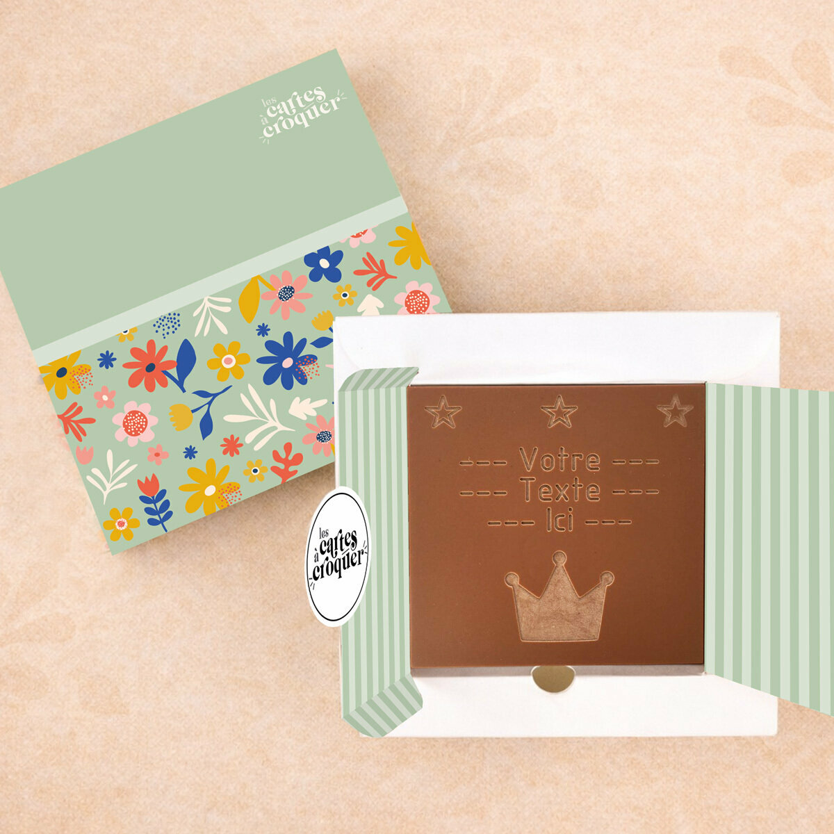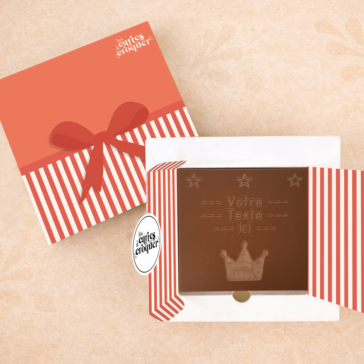 Chaque Carte à Croquer – Modèle Couronne & Étoiles est fabriquée artisanalement avec passion et minutie. Les chocolatiers sélectionnent des ingrédients de haute qualité pour offrir un chocolat fondant et riche en arômes. La gravure précise des motifs et du message personnalisé ajoute une touche artistique et raffinée. Offrir cette carte, c’est partager un chocolat d’exception qui séduit autant par sa saveur que par son aspect esthétique, faisant de chaque carte un petit chef-d’œuvre à déguster.