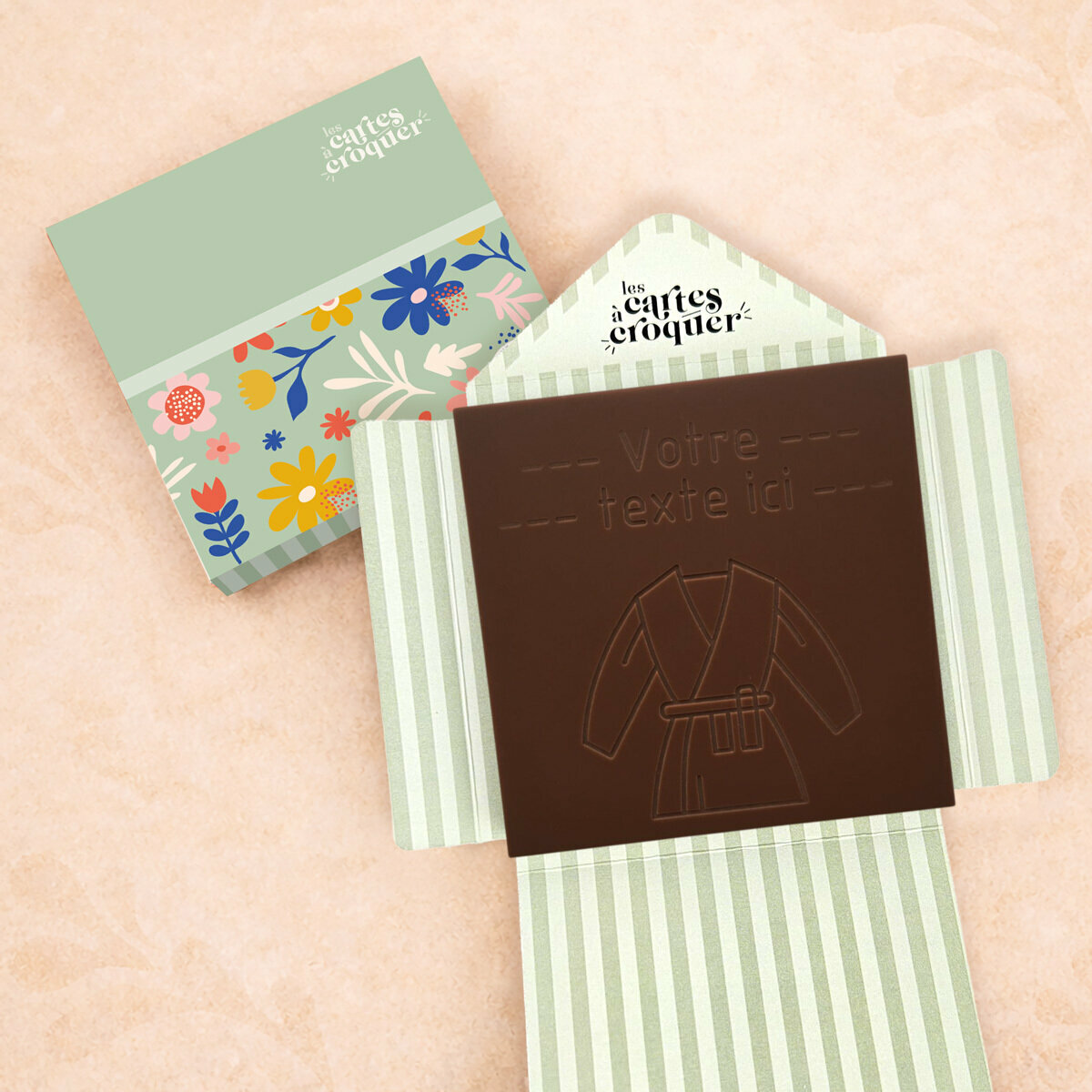 La Carte à Croquer – Modèle Kimono est une création originale qui allie force, élégance et gourmandise. Inspirée de l’univers des arts martiaux, elle met à l’honneur un design de kimono finement gravé dans le chocolat, accompagné de votre message personnalisé.